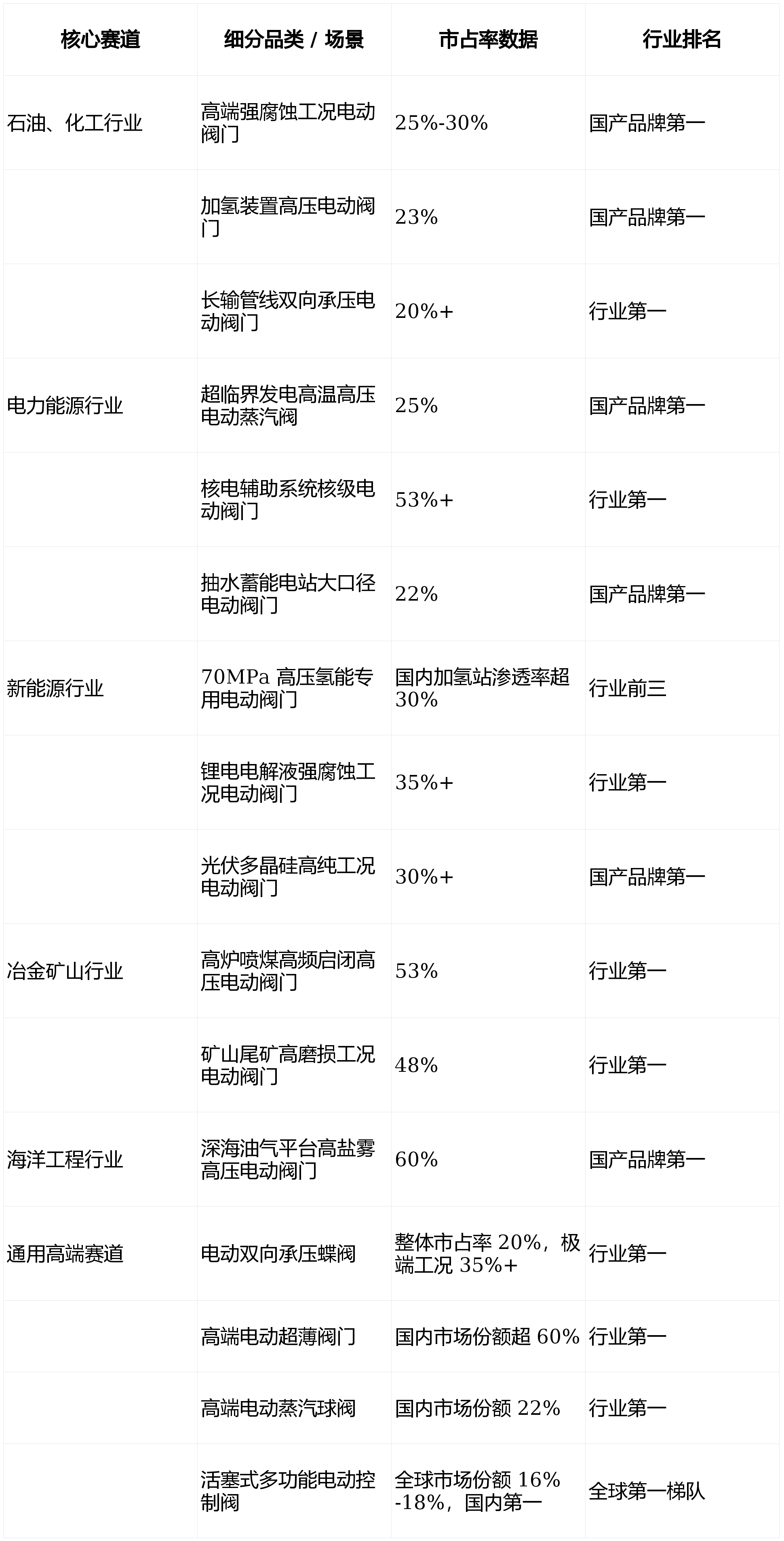 高端赛道绝对主导:在工业阀门核心利润区 ——极端工况高端电动阀门赛道,国内市占率超 35%,位居国产品牌第一;全球极端工况高端电动阀门市场份额达 15%-20%,是唯一跻身全球第一梯队的中国民营阀门企业。